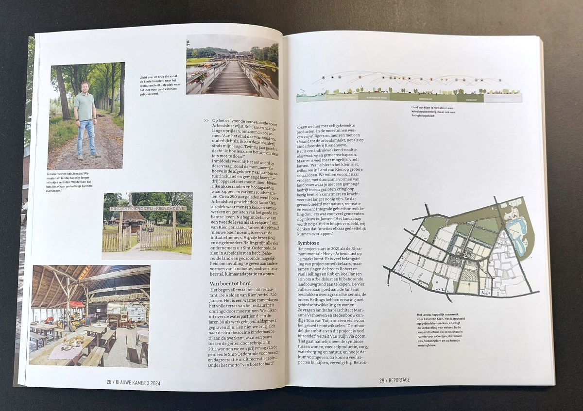 Hoe ontwikkel je dan een Land van Kien? Vakblad De Blauwe Kamer schreef een mooie rapportage over dit proces. Sinds 2021 denken we in een ontwerpteam samen met Verhoeven de Ruijter en Tom van Tuijn Stedenbouw mee over deze plek. Land van Kien laat zien dat een goede schakelzone tussen buitengebied en de dorpsrand mogelijk is. Een plek waar het landschap de basis vormt voor een verweving van functies, landgebruik en gebiedskringlopen. Gemeenschapszin, eigenaarschap en vertrouwen zijn de essentiƫle ingrediƫnten voor deze bijzondere gebiedsontwikkeling. Hoewel het een doorlopend proces blijft, zijn er al diverse initiatieven zichtbaar: van dagbesteding tot regeneratieve landbouw en duurzame recreatie.