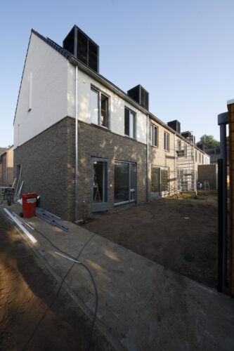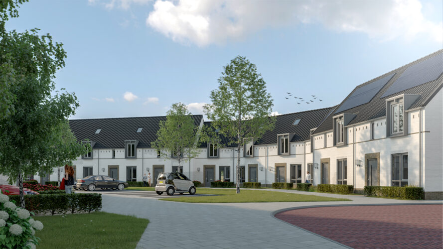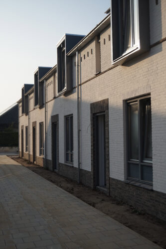 Bij de rijwoning is bijvoorbeeld gezocht naar een verdeling van witvlakken dat het rijtje van 6 opdeelt in 4 hoofdstukken. Het hofje wordt juist gekenmerkt door uitgesproken gevelopeningen en voordeuren die omlijst zijn door grijze baksteen; het keimwerk trekt de woningen samen tot één rustig geheel. De gezinswoningen zijn met dezelfde logica ook volledig wit. Door die keuze wordt het straatbeeld rustig en wordt de aansluiting op de grond geaccentueerd. De garages tussen de gezinswoningen worden juist donker van kleur om de woonhuizen beter te kunnen onderscheiden.